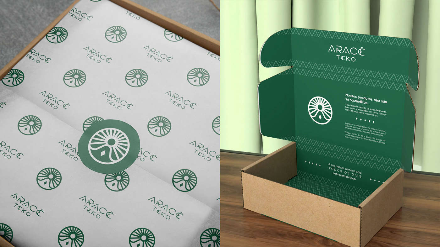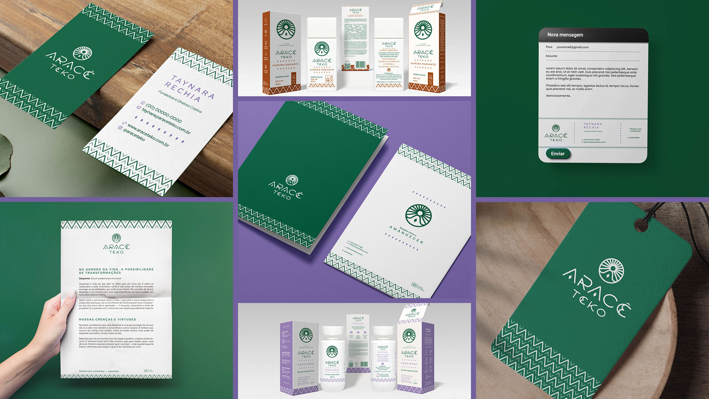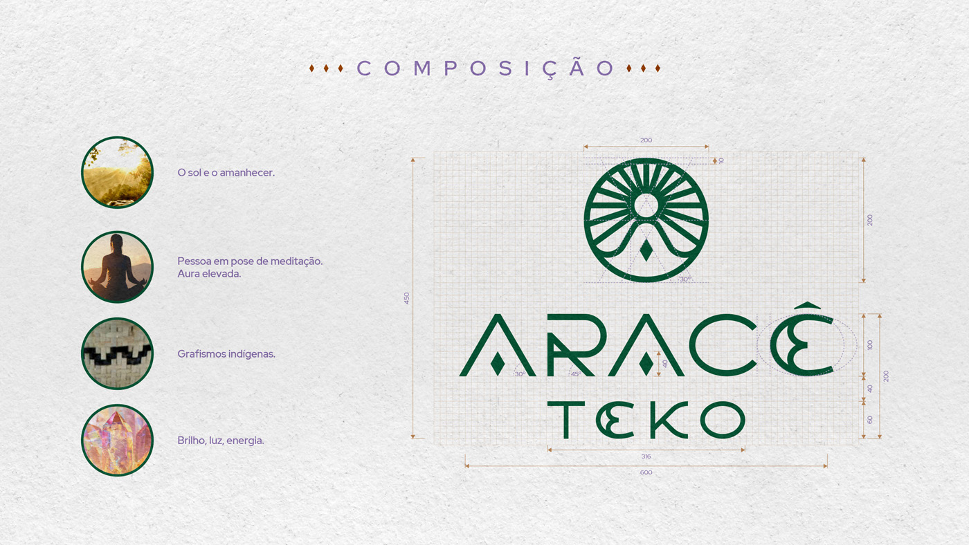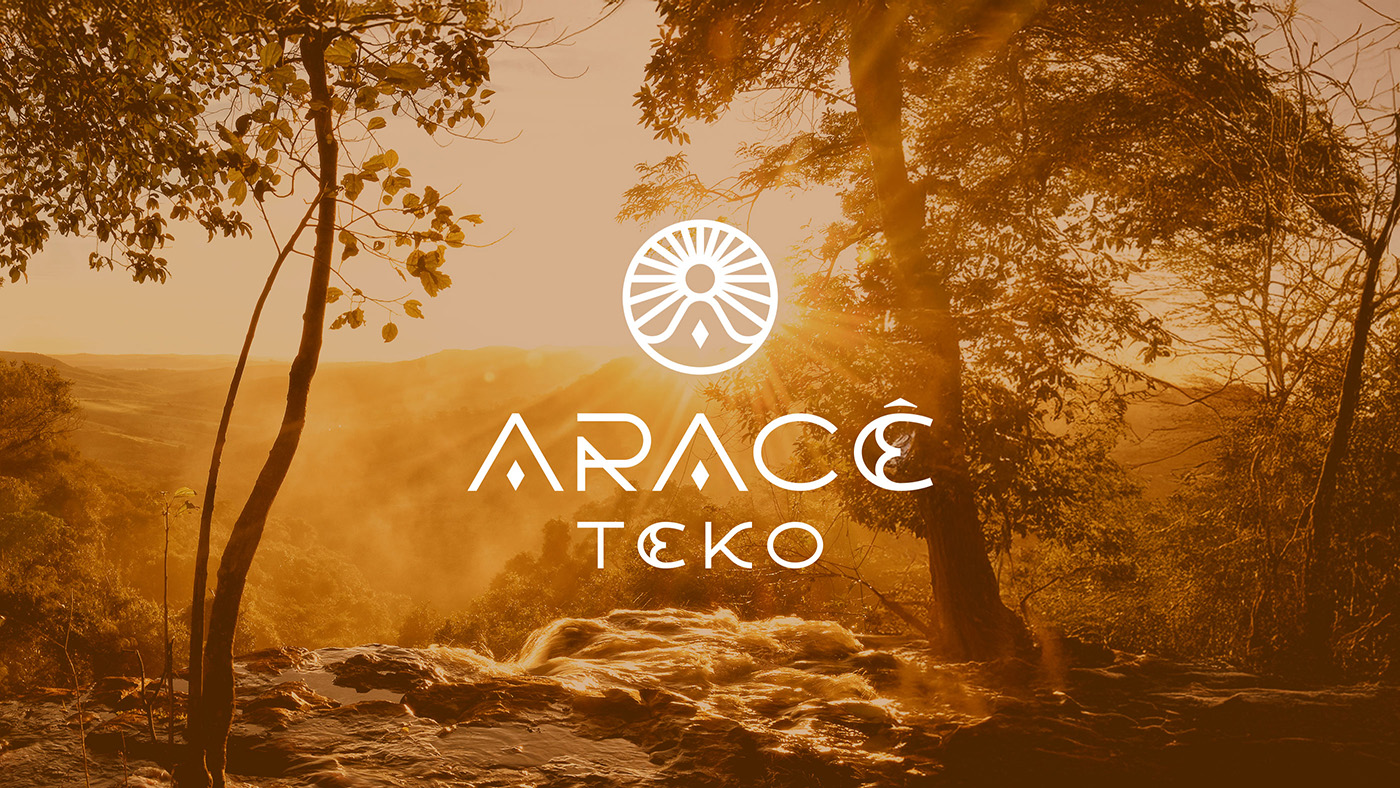 A identidade nasce dessa fusão: luz + rotina. O símbolo combina sol, figura meditativa (em forma de “A”) e um losango central, como um núcleo de luz. O sistema se completa com lettering autoral, paleta natureza-terra e padronagem abstrata inspirada em ritmos de cestarias Guarani Mbya (referência formal, não literal).
