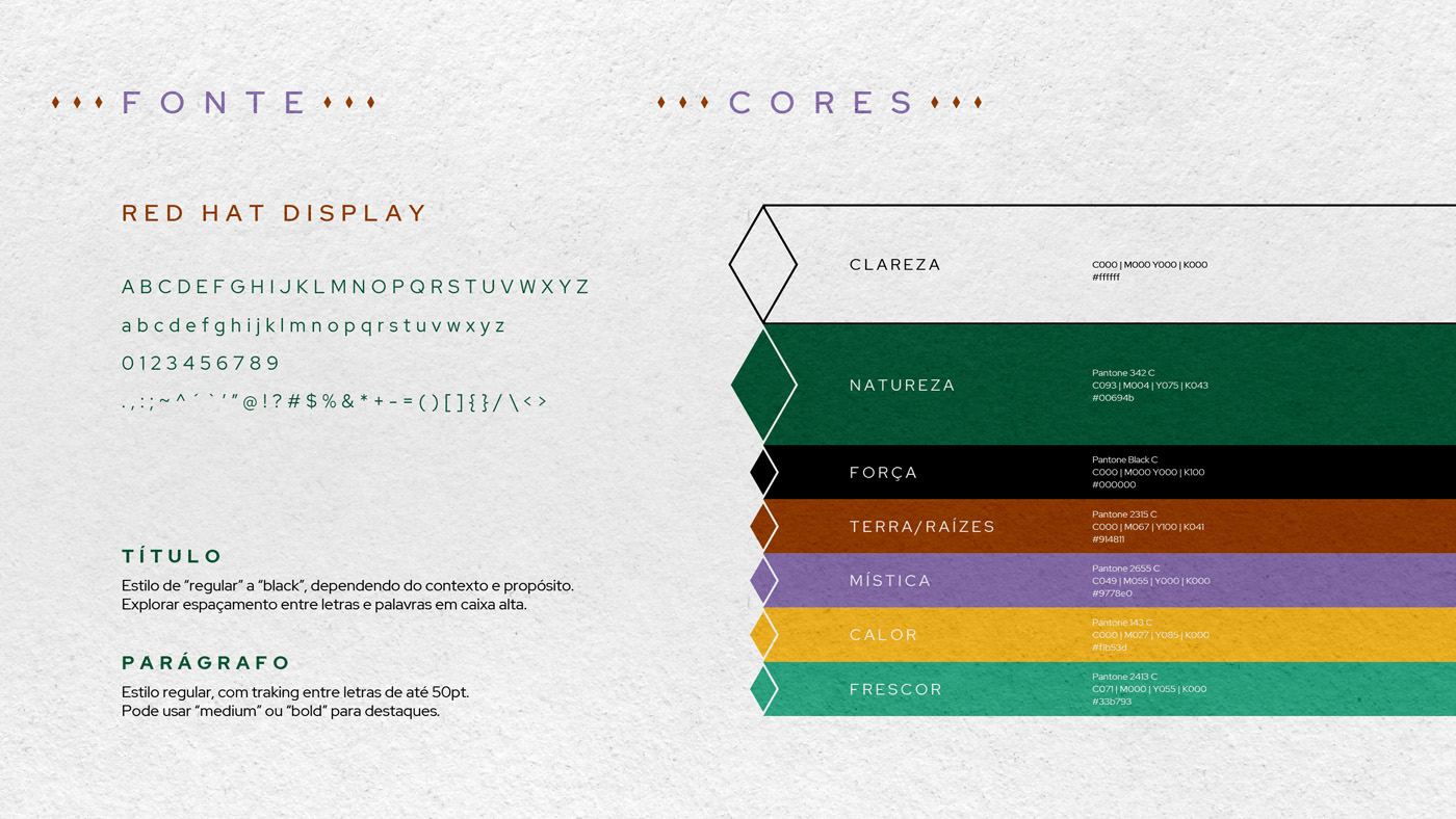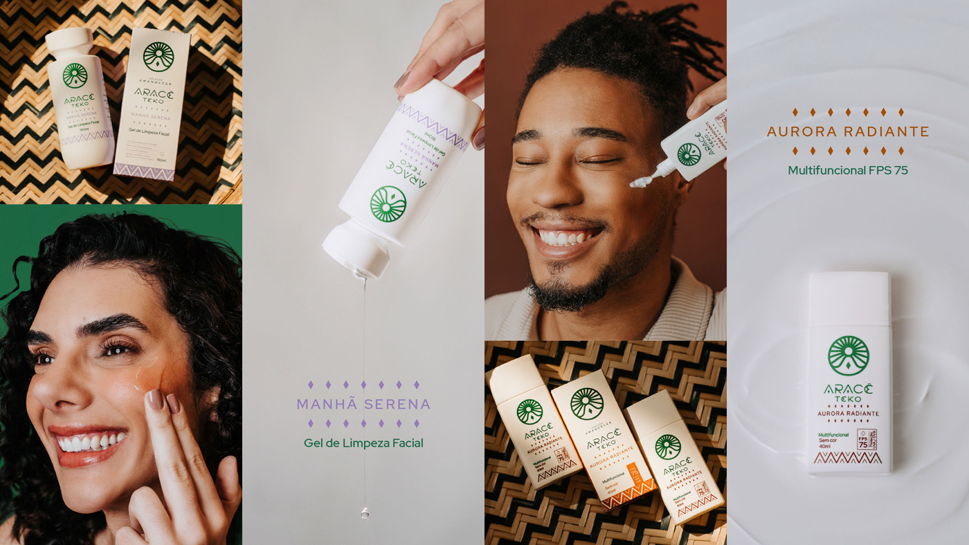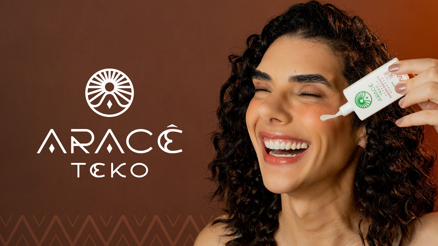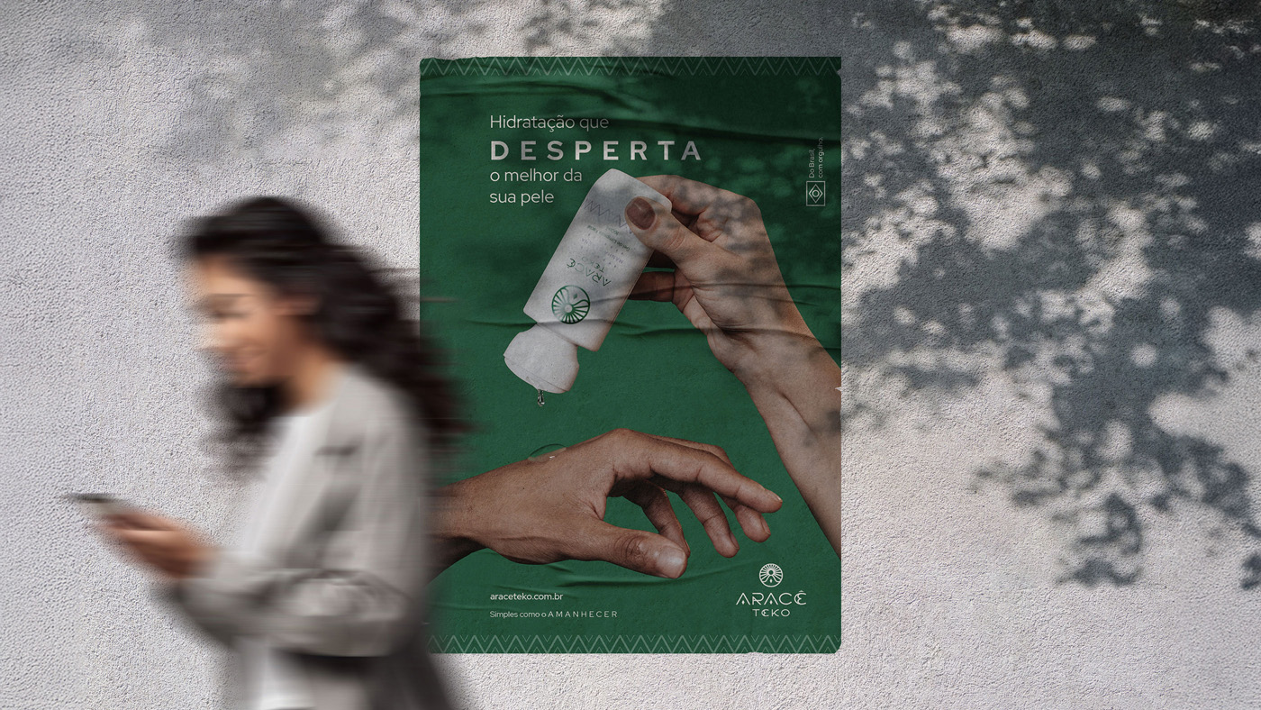 A identidade nasce dessa fusão: luz + rotina. O símbolo combina sol, figura meditativa (em forma de “A”) e um losango central, como um núcleo de luz. O sistema se completa com lettering autoral, paleta natureza-terra e padronagem abstrata inspirada em ritmos de cestarias Guarani Mbya (referência formal, não literal).
